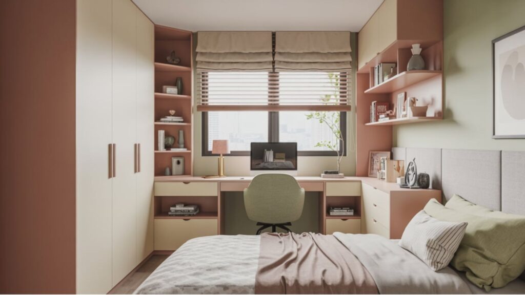 - Set up a compact, dual-purpose desk area against a quiet wall with wall shelves. This keeps your footprint tiny and ensures you can still move around without bumping into everything.